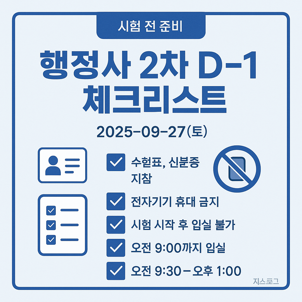 내일(2025-09-27 토) 행정사 제13회 2차 시험이 전국 고사장에서 일제히 시행됩니다. 수험표 출력본과 공단 인정 신분증 지참, 전자기기 반입 금지, 시험 시작 후 입실 불가 등 주요 유의사항을 재차 안내드립니다. 수험생 여러분께서는 고사장 위치·입실 가능 시간·교통 상황을 오늘 중 반드시 재확인하시기 바랍니다.